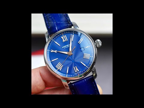 • Mặt số: Màu xanh lam với họa tiết guilloché “ngôi sao bùng nổ” đặc trưng của Montblanc