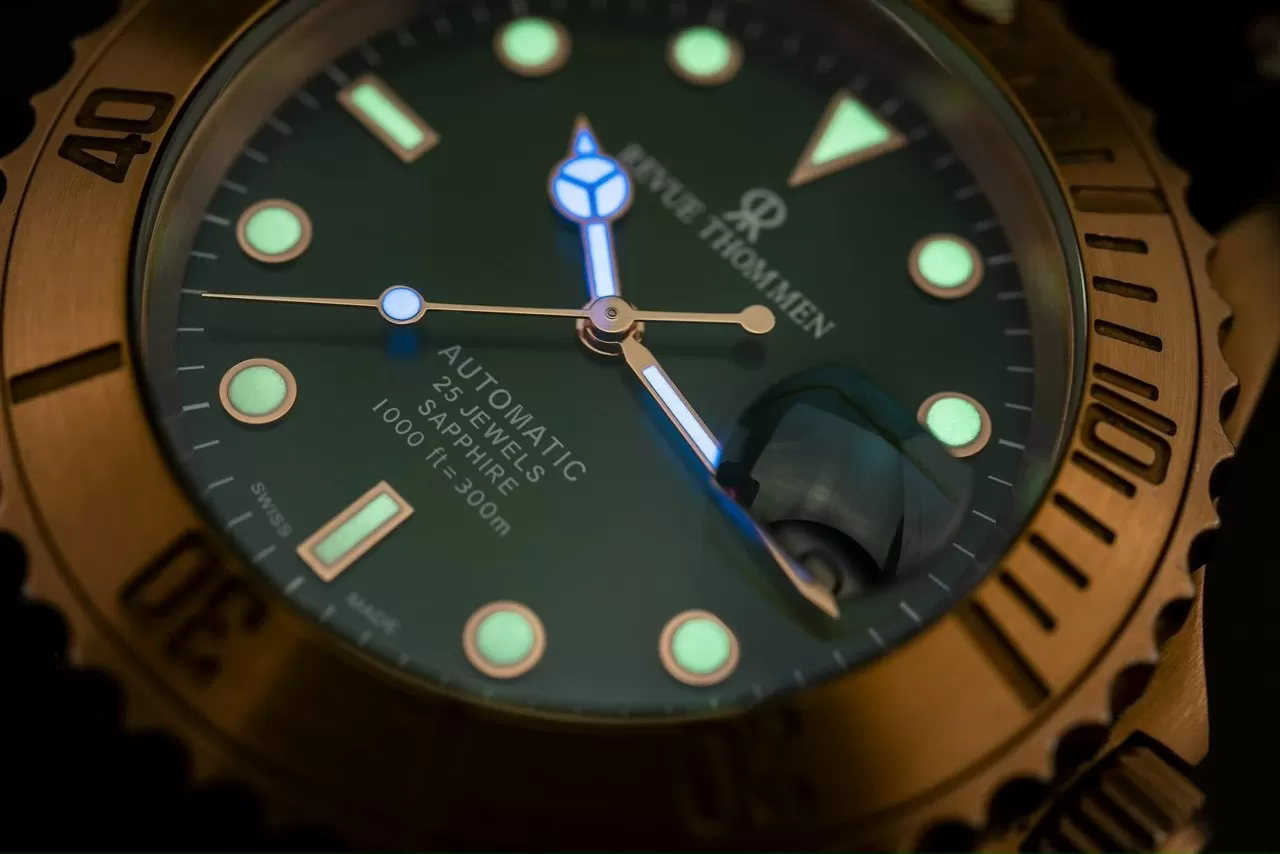 - Vòng ren ở núm chỉnh giờ: Núm chỉnh giờ là vị trí dễ khiến đồng hồ bị vào nước nhất do thường xuyên phải tháo mở liên tục, do đó, có đến hai bằng sáng chế để làm cho núm chỉnh giờ của những chiếc đồng hồ lặn trở nên hoàn hảo hơn.- Dạ Quang Cực Sáng : Độ phát quang thường sẽ xuất hiện tại các số ở vòng số và trên kim giờ và kim phút của đồng hồ giúp bạn dễ cập nhật giờ ở nơi tối tăm sâu dưới biển.