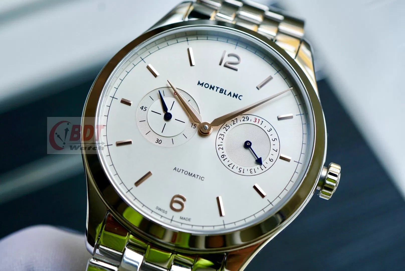 - Vỏ đồng hồ được làm bằng thép không ghỉ 316L. Niềng đồng hồ được làm bằng vàng hồng 18k cao cấp. Dial trắng cơ bản được thiết kế với 2 kim đơn giản, bộ đếm giây được nhà sản xuất khéo léo đặt trong vòng tròn nhỏ có logo của Montblanc ngay góc 6h làm điểm nhấn cực đẹp.
