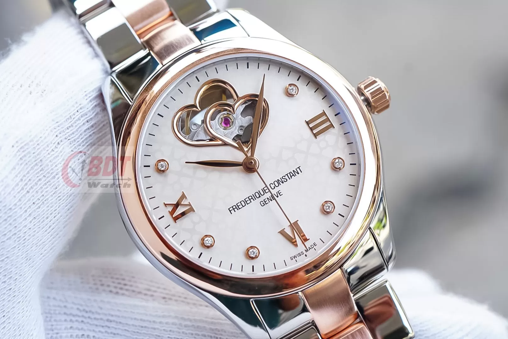 - Được trang bị bộ máy FC-310 Heart Beat Automatic, tần số dao động 28800 vph, 26 chân kính, thời gian trữ cót lên đến 38h. Mặt dial thiết kế open heart với 2 trái tim lòng vào nhau rất đẹp và sang chảnh. 6 cọc số được đính kinh cương sang trọng.