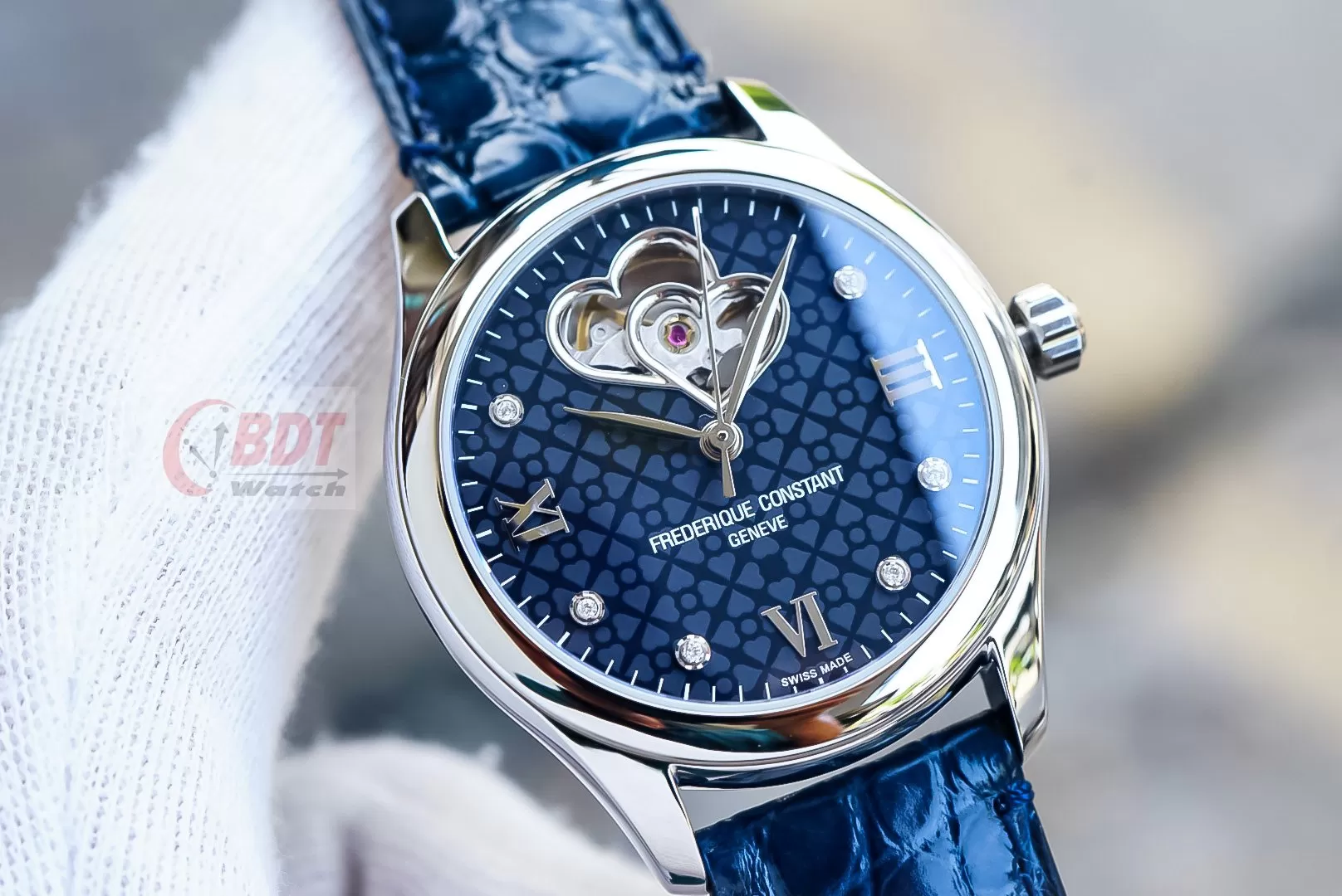- Là mẫu đồng hồ dành cho phái đẹp nằm trong bộ sưu tập FC-310 Double Heart Beat với thiết kế Open heart ( lộ máy ) 2 trái tim lồng vào nhau rất độc đáo và đẹp mắt. Cùng với đó là dial màu xanh với rất nhiều họa tiết hình trái tim lồng vào nhau rất đẹp. Cọc số còn đính 6 viên kim cương thật 100%